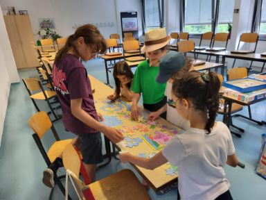 Último día de clase con juegos y aprendizaje. En el Aula de Leipzig (Sajonia), dedicamos el último día de clase a estaciones de juegos, en las que pudimos disfrutar de la oca, el parchís, el Uno, el Pasapalabra y otras actividades lúdicas. En la foto, vemos a un grupo de alumnas montando un puzzle antes de hacer un quiz sobre la geografía de España.