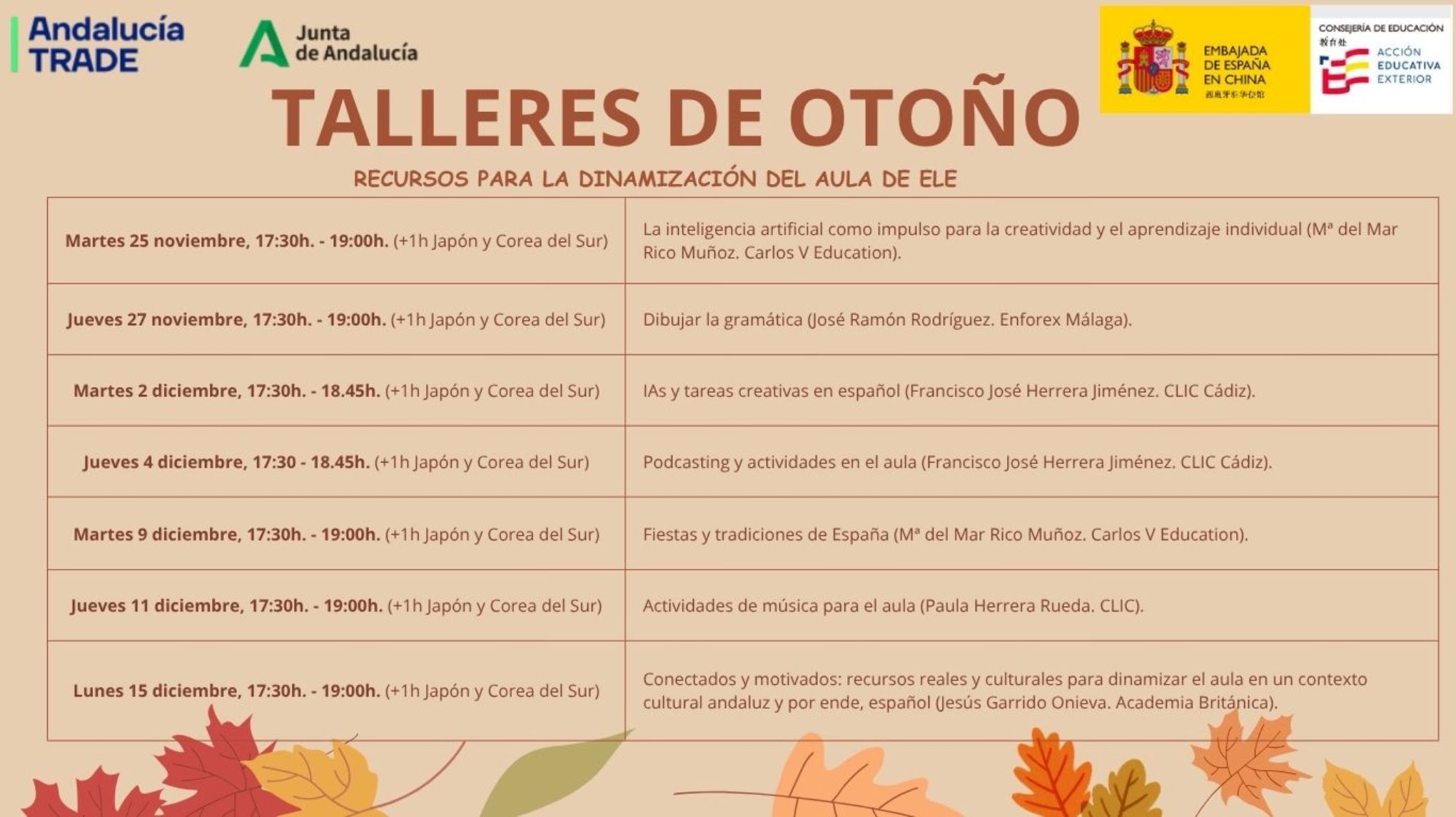 La Consejería de Educación para China, Corea del Sur y Japón y TRADE han organizado estos talleres formativos de otoño, en línea y gratuitos, para el profesorado de español de estos países de cualquier nivel educativo. Los talleres se desarrollarán a través de Zoom. Están diseñados para ofrecer al profesorado ideas prácticas que ayuden a dinamizar y hacer más motivantes las clases de español.