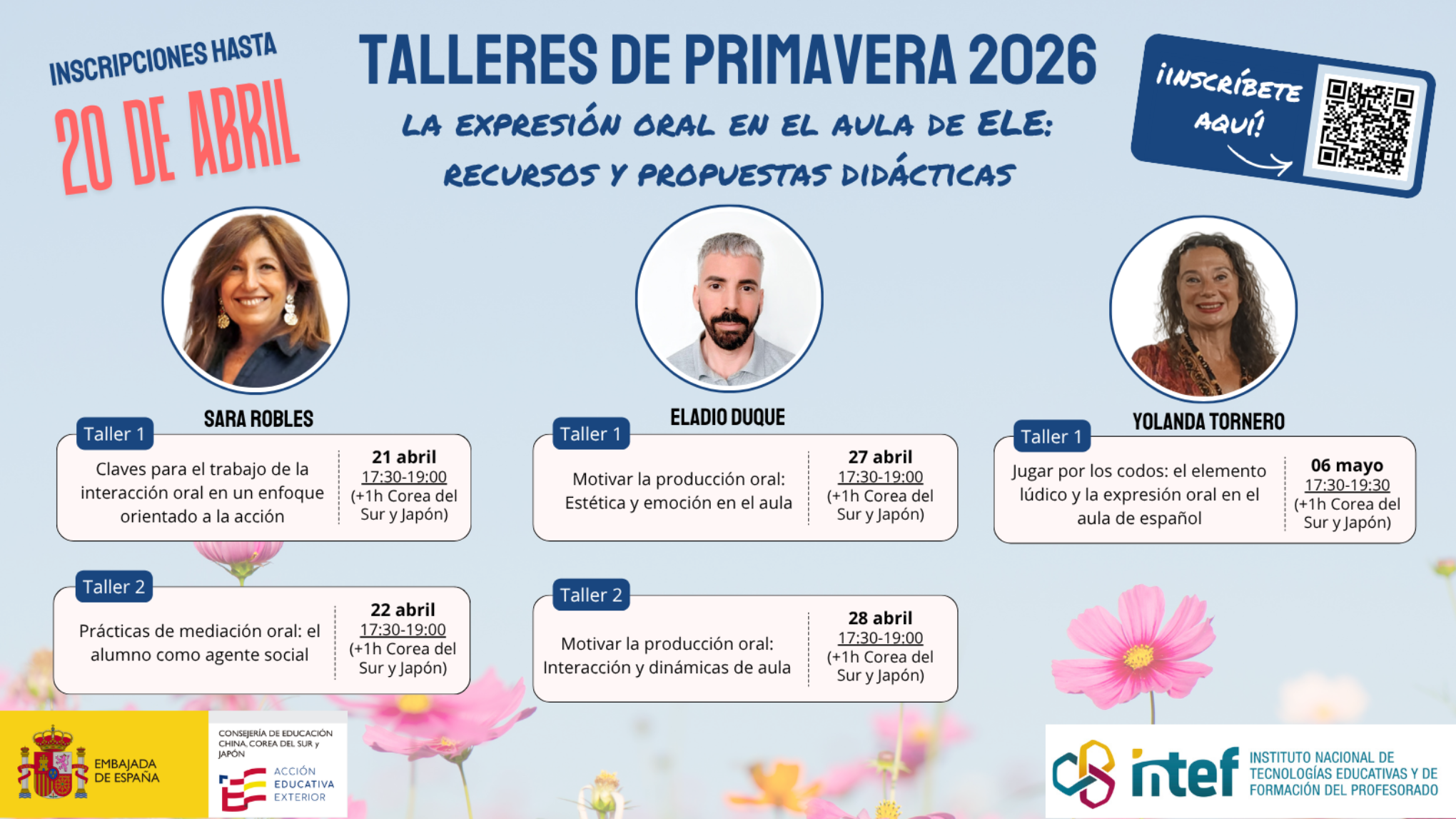 La Consejería de Educación para China, Corea del Sur y Japón ha organizado estos talleres formativos de primavera, en línea y totalmente gratuitos, para el profesorado de español de estos países de cualquier nivel educativo. Esta formación está diseñada para ofrecer al profesorado ideas prácticas y recursos didácticos que puedan ser de utilidad para la enseñanza de la expresión oral en el aula de español como lengua extranjera.