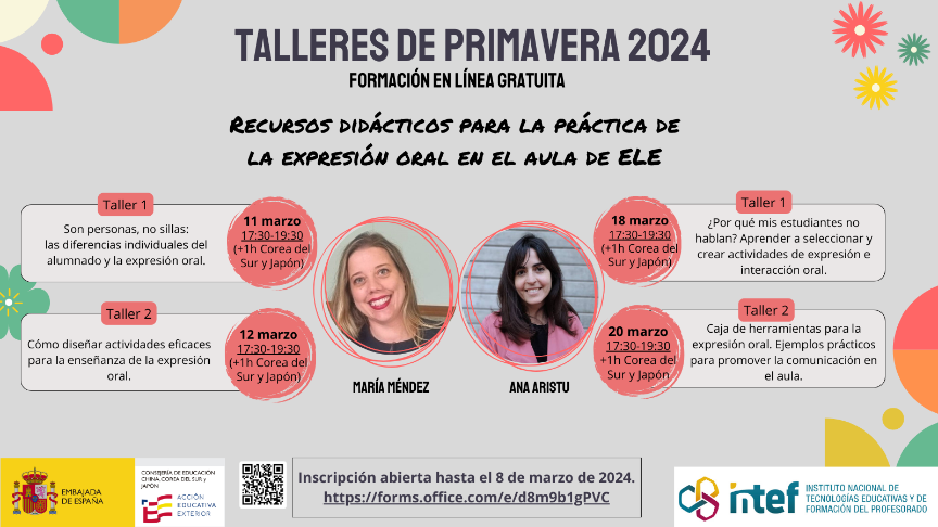 La Consejería de Educación para China, Corea del Sur y Japón ha organizado estos talleres formativos de primavera, en línea y totalmente gratuitos, para el profesorado de español de estos países de cualquier nivel educativo. Esta formación está diseñada para ofrecer al profesorado ideas prácticas y recursos didácticos que puedan ser de utilidad para la enseñanza de la expresión oral en el aula de español como lengua extranjera.