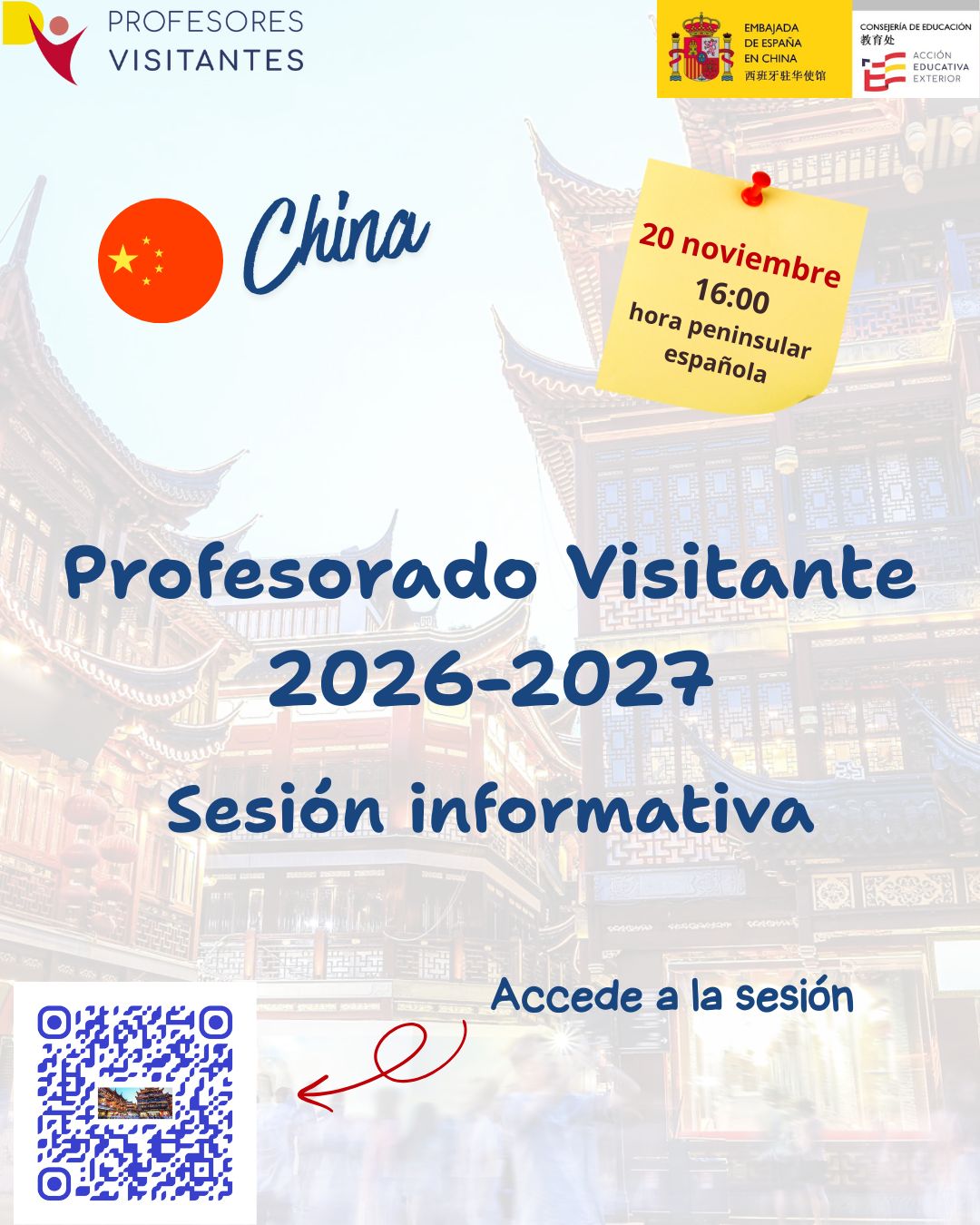 Profesorado Visitante 2026-2027: Reunión informativa para plazas en China. Para más información pincha aquí.