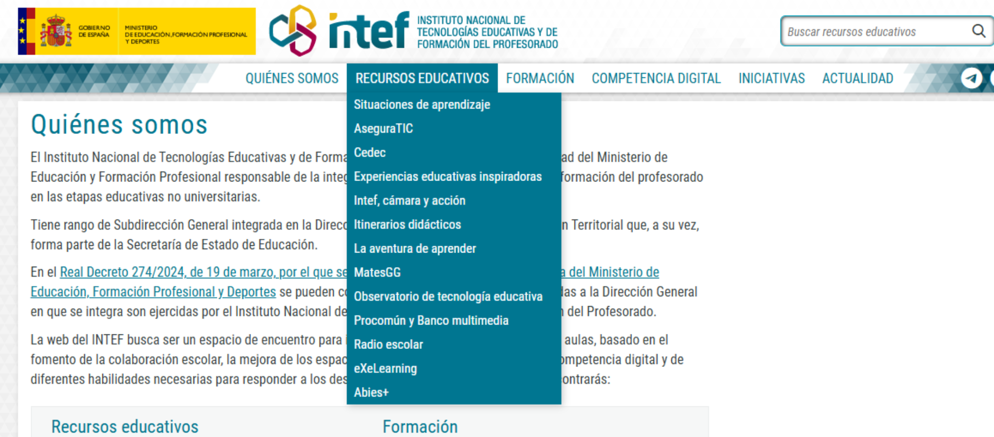 El Instituto Nacional de Tecnologías Educativas y de Formación del Profesorado (INTEF) es la unidad del Ministerio de Educación y Formación Profesional responsable de la integración de las tecnologías digitales y la formación del profesorado en las etapas educativas no universitarias.