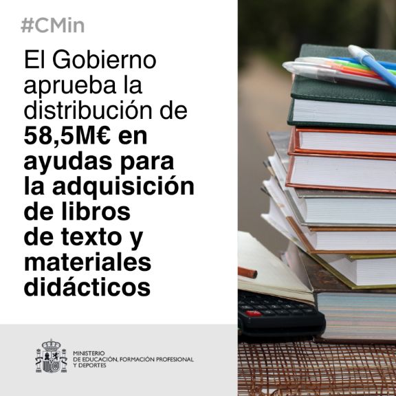 El Ministerio de Educación, Formación Profesional y Deportes distribuirá este año a las comunidades autónomas 58.559.610 euros destinados a ayudas para las familias para la adquisición de libros de texto y material didáctico.