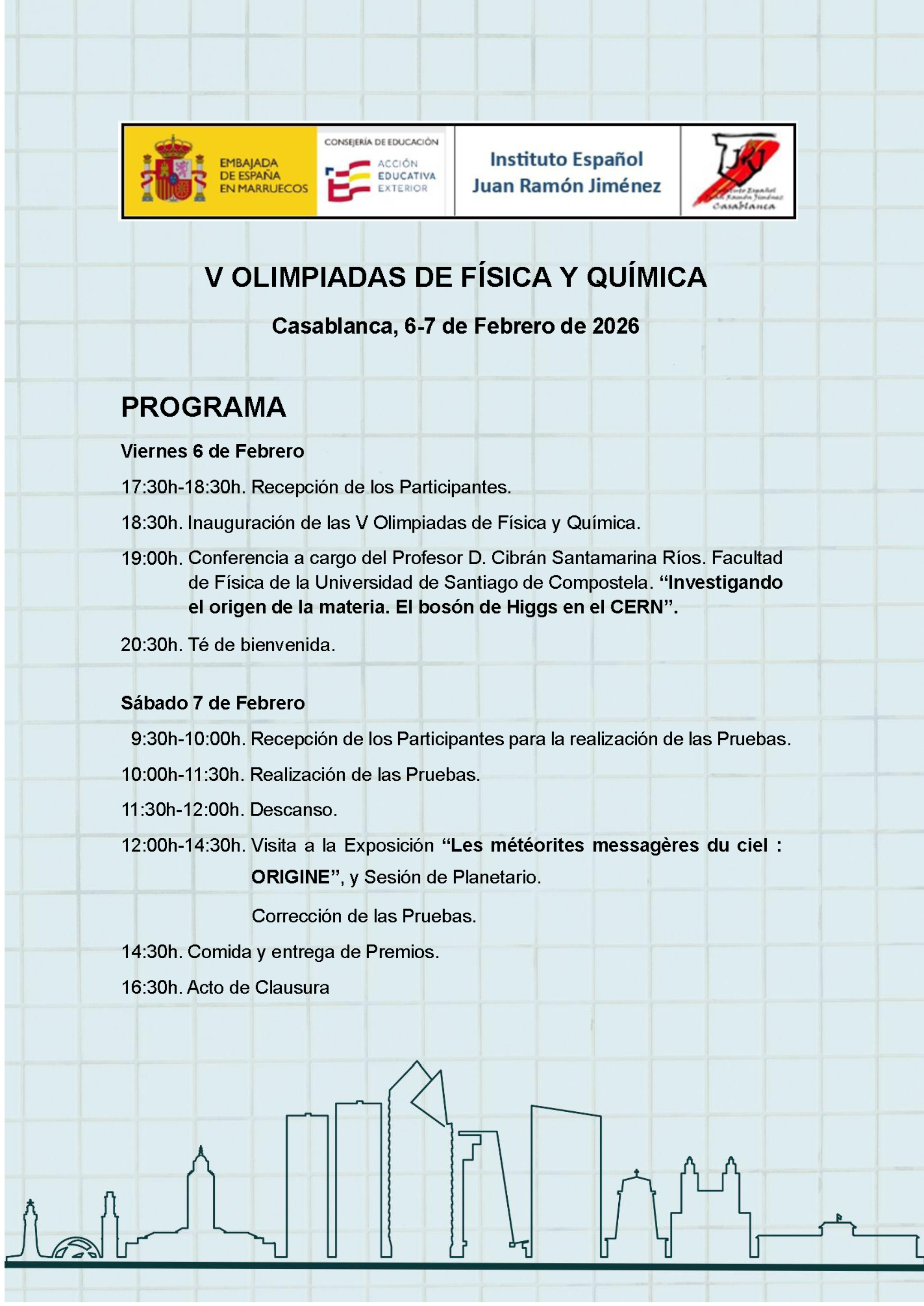 Información sobre las Olimpiadas de Física y Química que tendrán lugar en el I.E Juan Ramón Jiménez de Casablanca los próximos 6 y 7 de febrero de 2026.