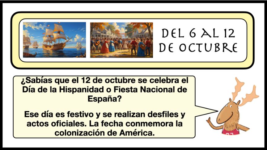 Con motivo de la fiesta nacional, durante la semana del 6 al 10 de octubre hemos trabajado en el aula diferentes actividades sobre el día de la Hispanidad. Manualidades, lecturas, visionados de vídeos y actividades digitales han sido algunas de las actividades llevadas a cabo.