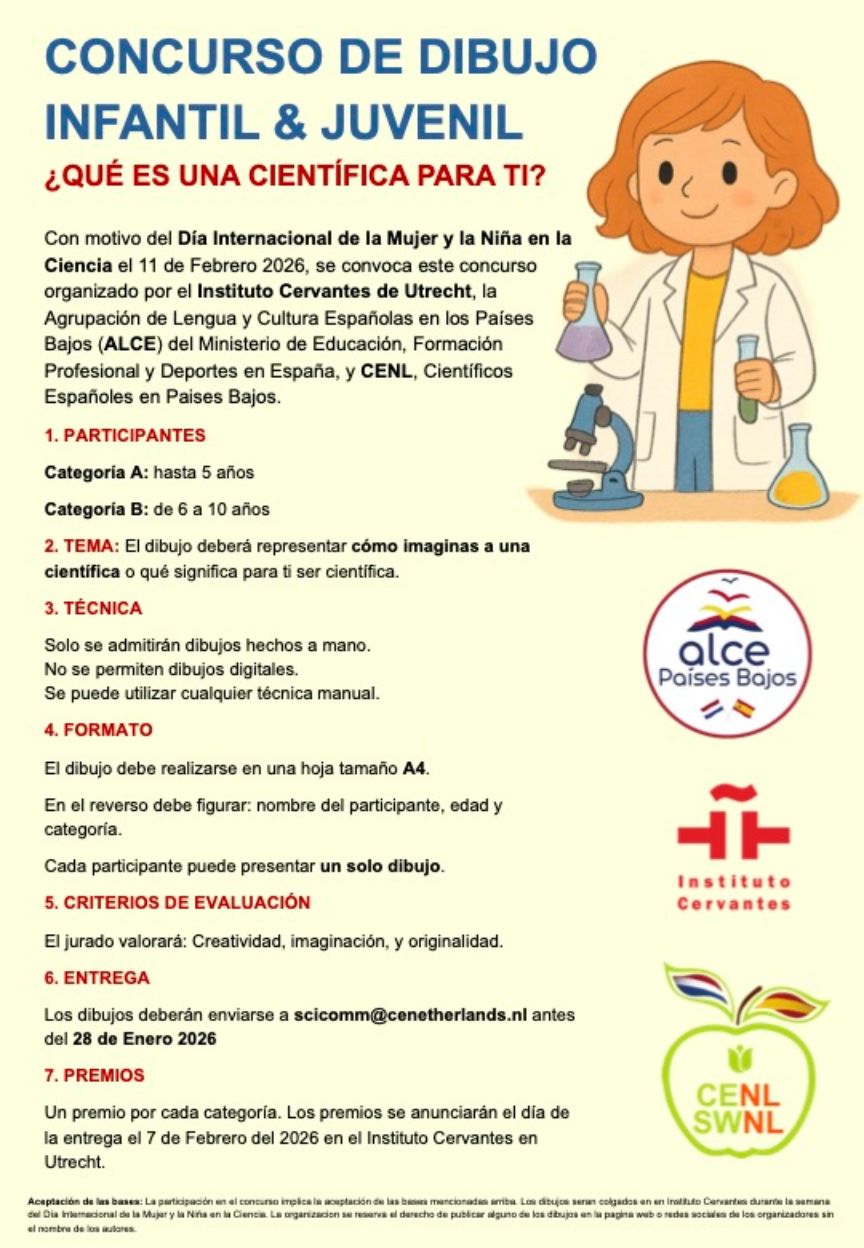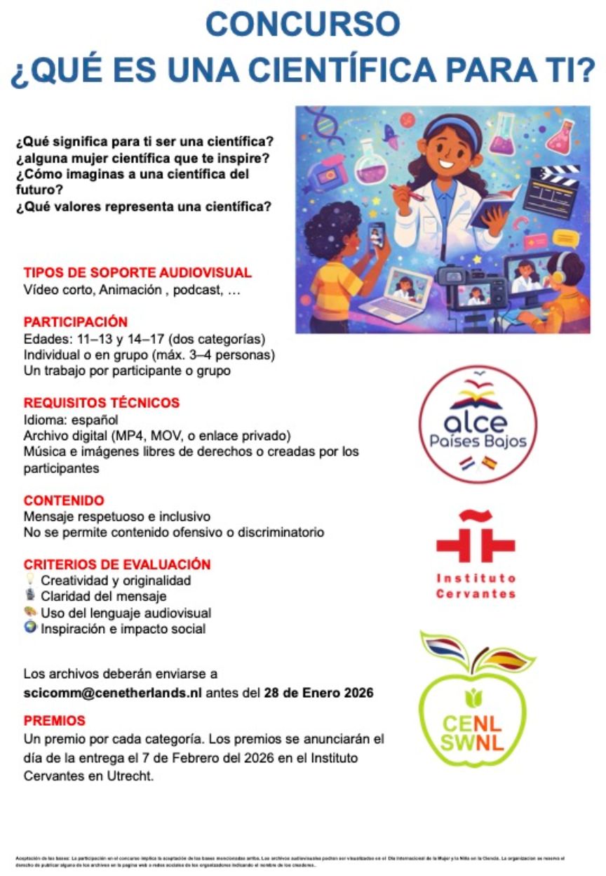 Con motivo del Día Internacional de la Mujer y la Niña en la Ciencia el 11 de Febrero 2026, se convoca este concurso organizado por el Instituto Cervantes de Utrecht, la Agrupación de Lengua y Cultura Españolas en los Países Bajos (ALCE) del Ministerio de Educación, Formación Profesional y Deportes en España, y CENL, Científicos Españoles en Países Bajos.