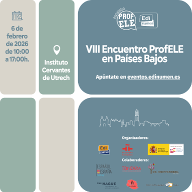 El viernes 6 de febrero de 2026, de 10:00 a 17:00, se celebra el VIII Encuentro ProfELE en el IC de Utrecht, organizado por la Consejería de Educación, el Instituto Cervantes de Utrecht y la editorial Edinumen. Su programa consta de cuatro talleres que abordan diferentes aspectos de la enseñanza-aprendizaje de ELE. Además, habrá sorteo de becas y materiales didácticos.