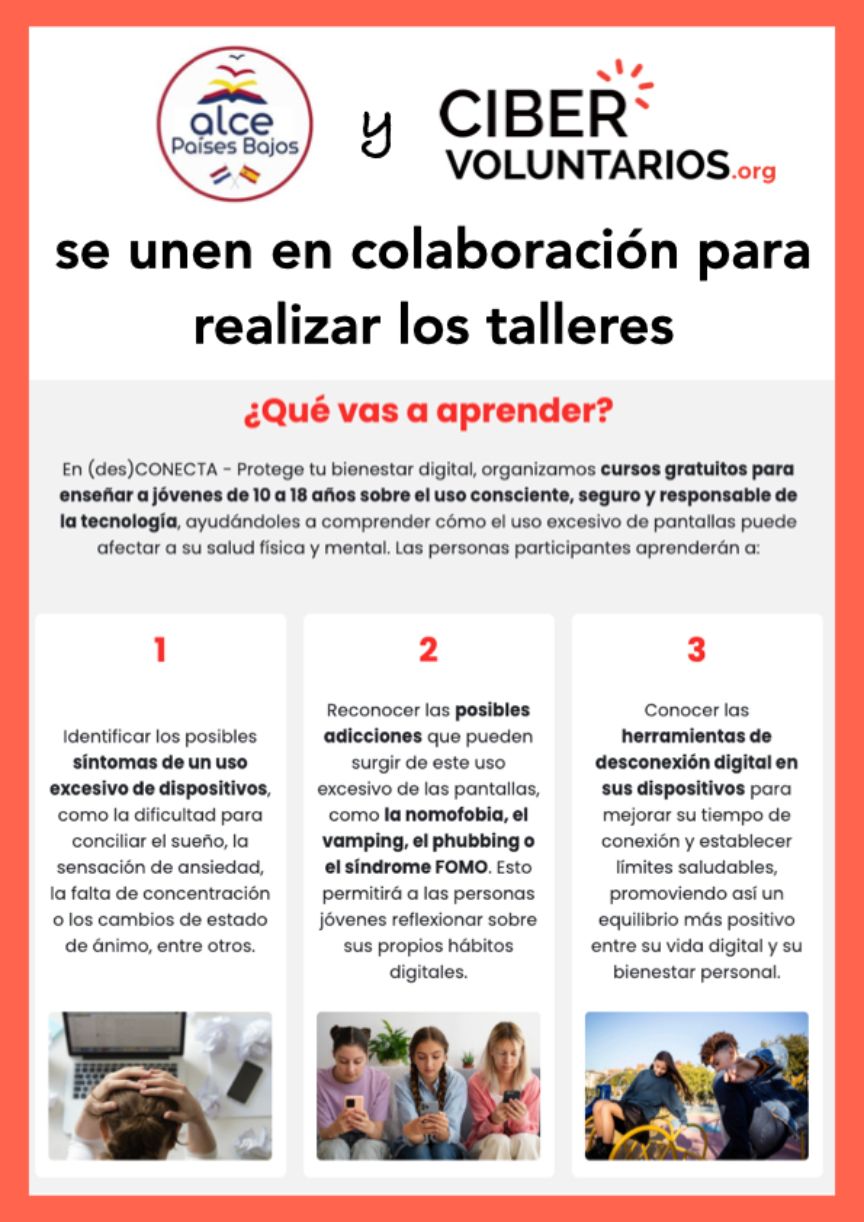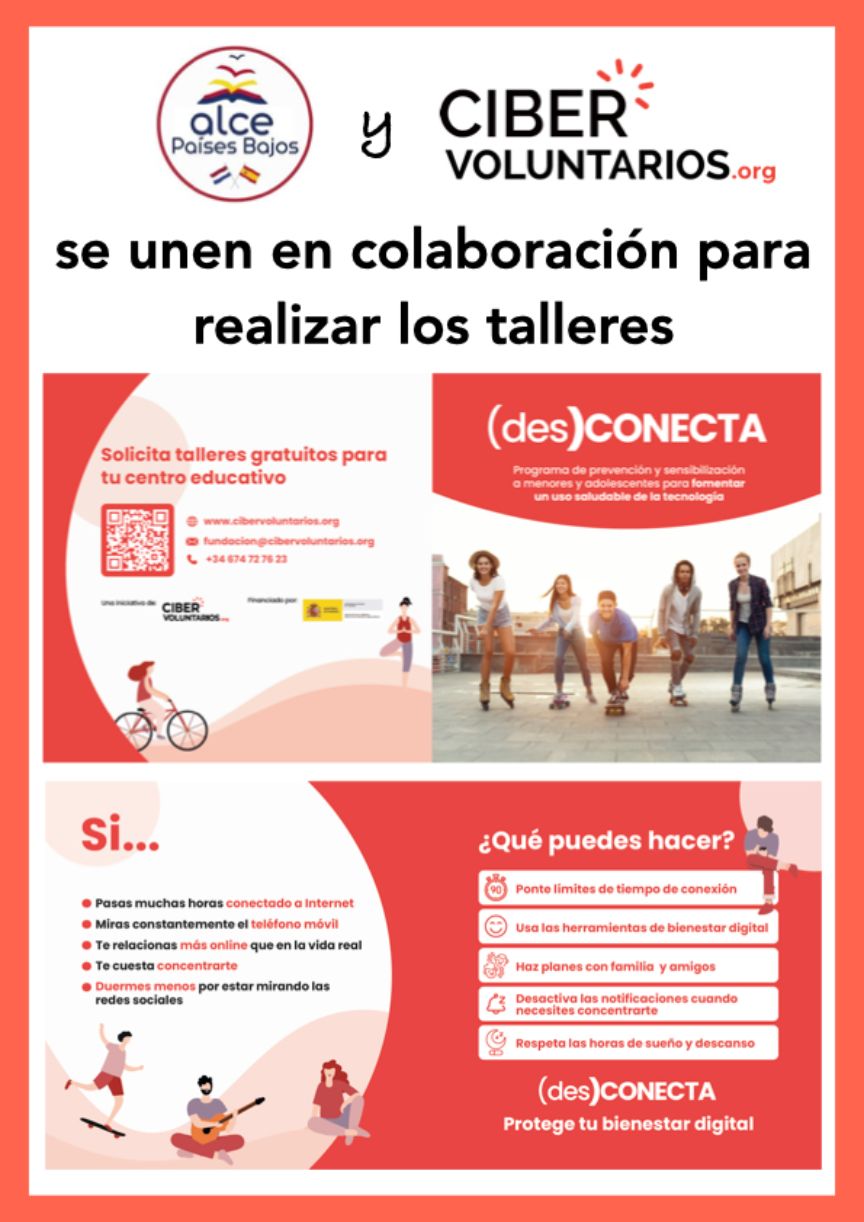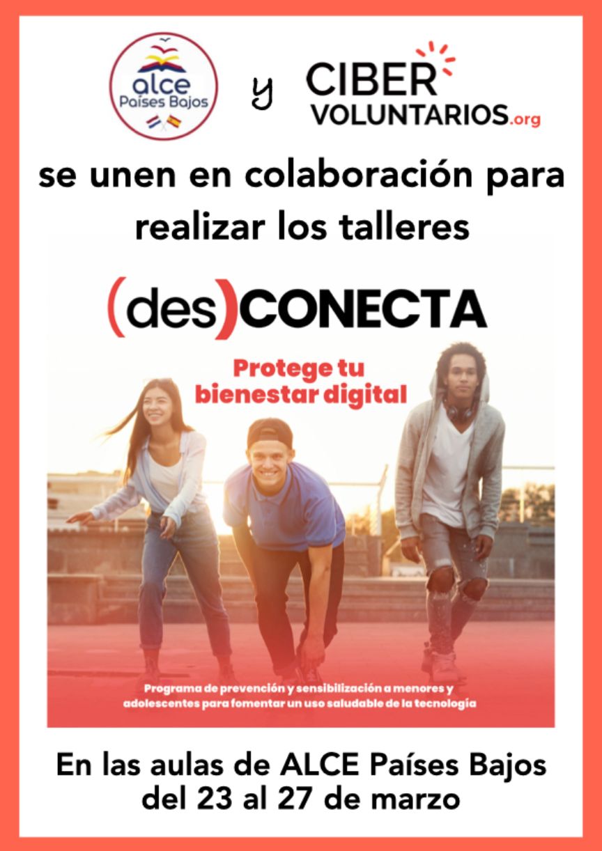 Durante la semana del 23 al 27 de marzo se van a realizar en las aulas de ALCE Países Bajos los talleres “desCONECTA“. Se trata de un programa de prevención y sensibilización a menores y adolescentes para fomentar un uso saludable de la tecnología. Los talleres, impartidos por la asociación ciber voluntarios ayudará a comprender cómo el uso excesivo de pantallas puede afectar a su salud física y mental.