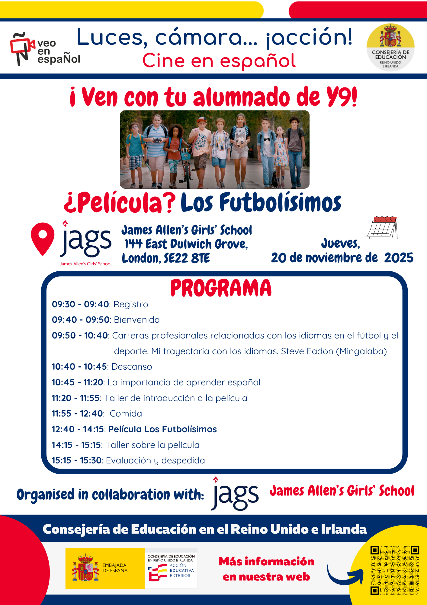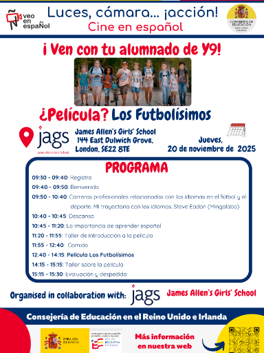 El proyecto de cine "Luces, Cámara, Acción" es una iniciativa educativa de la Consejería de Educación en el Reino Unido destinada a promover la lengua y cultura españolas entre estudiantes desde Primaria hasta Bachillerato (A-level). A través del cautivador medio del cine, este proyecto busca mejorar las habilidades lingüísticas, la conciencia cultural y la apreciación del rico patrimonio de los países de habla hispana. Al integrar el cine en el currículo, nuestro objetivo es crear una experiencia de aprendizaje atractiva e inmersiva que trascienda los límites tradicionales del aula.