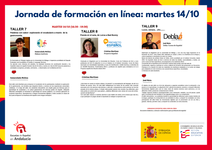 «Palabras con sabor: explorando el vocabulario a través de la gastronomía», «Poesía en el aula, de Lorca a Bad Bunny» y «Luces, cámara... ¡Dicción!»