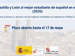 La Consejería de Educación de la Embajada de España en el Reino Unido, con el patrocinio de la Consejería de Cultura y Turismo de la Junta de Castilla y León, convoca anualmente el premio al alumno o alumna con los mejores resultados en español en el Reino Unido que tenga, además, el mejor expediente académico. Plazo de presentación de solicitudes: del 1 de abril de 2026 al 17 de mayo de 2026.