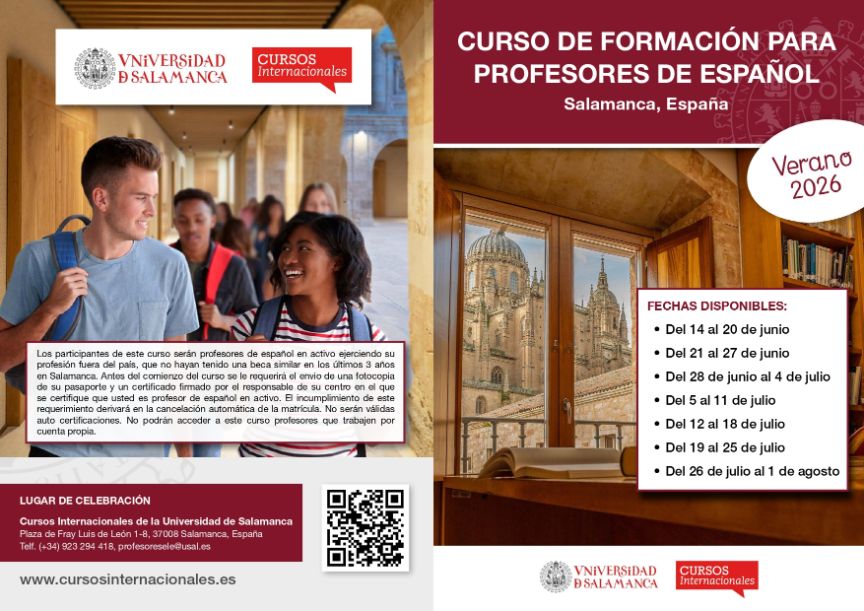 La Universidad de Salamanca y sus Cursos Internacionales, ofrecen becas para profesores de español en activo fuera de España para realizar un curso de lengua y cultura españolas y de actualización didáctica de una semana de duración en Salamanca. El único requerimiento adicional es ser profesor de español y no haber disfrutado en Salamanca un curso similar en los últimos tres años.