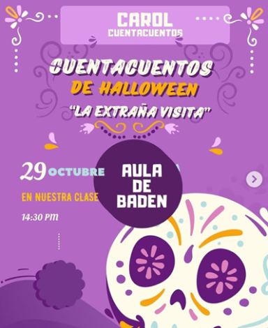 El miércoles 29 de octubre, la mamá de nuestra aula de Baden Dª Carolina Cabrera, “Carolcuentacuentos”, nos hizo una maravillosa representación teatralizada en forma de cuentacuentos del libro La extraña visita, escrito por Gracia Iglesias e ilustrado por Vicente Cruz. El alumnado del nivel A1 del aula de Baden, cuyo profesor es Luis Patricio Pérez, pudo disfrutar de una terrorífica y divertida visita de un entrañable personaje en la voz de Carol, a quien queremos agradecer su ofrecimiento y actuación.