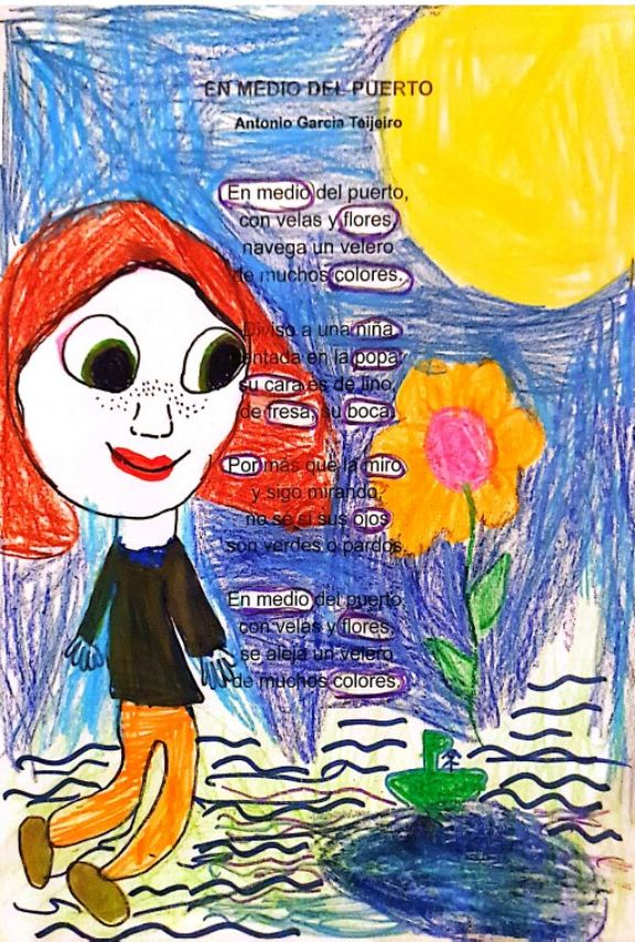 Salto de línea Lucía Lorenzo. Nivel A1-A2.1Salto de línea La obra refleja fielmente la atmósfera evocadora del poema. La representación de la niña con rasgos expresivos y los colores llamativos potencian la imagen descrita en los versos.Salto de línea Lucía logra transmitir la sensación de misterio en los ojos de la protagonista, un elemento clave del poema.Salto de línea