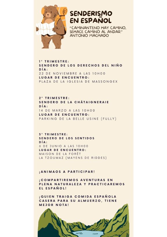 Senderismo en español es una propuesta educativa organizada en tres salidas (una por trimestre) en las que aprenderemos y utilizaremos el español en contextos reales fuera del aula.