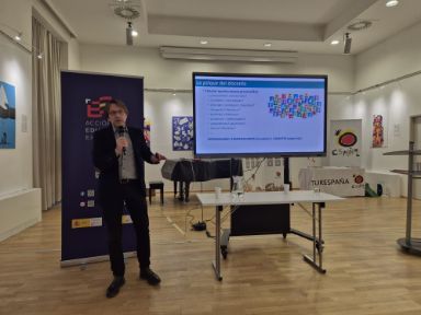 Con presencia de nuestro consejero de Educación, Antonio Serrano, el pasado sábado 15 de noviembre se ha celebrado con gran éxito en Viena la I Jornada de Formación de Profesorado Español en Austria. Bajo el título de “Construyendo aulas que inspiran: del diseño didáctico al bienestar docente”, durante todo el día medio centenar de profesores de español de Austria y también de otros países vecinos como Eslovaquia y Rumanía siguieron las interesantes y variadas ponencias de los expertos Roger Gilabert, Maria Nogués y Javier Olivera. Jornada Formación profesorado de español en Austria ![]()